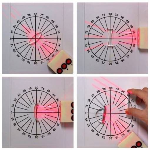Demonštrácia lomu svetla cez rôzne druhy optických prvkov pomocou troch lúčového lasera.