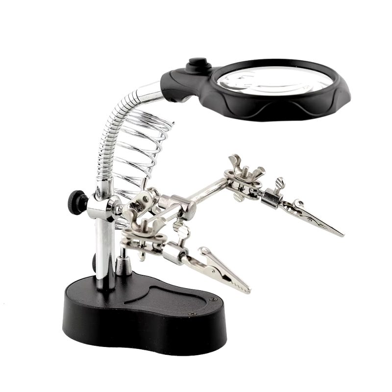 Tento spájkovací stojan je výborným pomocníkom pre precízne spájkovacie práce. Je vybavený veľkou lupou na flexibilnom ramene, ktorá vám umožní vidieť na pracovnú plochu s vysokým zväčšením. Integrované LED osvetlenie zlepšuje viditeľnosť detailov a presnosť práce. LED je na batériovú prevádzku, stojan nevyžaduje žiadny napájací adaptér alebo elektrickú zásuvku. Stojan má dve praktické svorky, ktoré udržia elektronické súčiastky a drôty pevne na mieste počas spájkovania. Tieto svorky sú tiež umiestnené na otočných kĺboch, umožňujúce rýchle a jednoduché nastavenie pozície a uhla držania súčiastok. Ďalšou užitočnou funkciou je odkladač na hrotovú spájku.