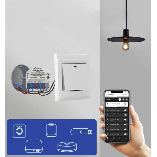 Podomietkový riadiaci modul kompatibilný s protokolom Zigbee 3.0 s reléovým výstupom. Je to všestranné a flexibilné riešenie pre širokú škálu úloh. Vďaka technológii ZigBee 3.0 podporuje inteligentné ovládanie, pričom možno ovládať aj manuálne pomocou bežných prepínačov alebo tlačidiel.