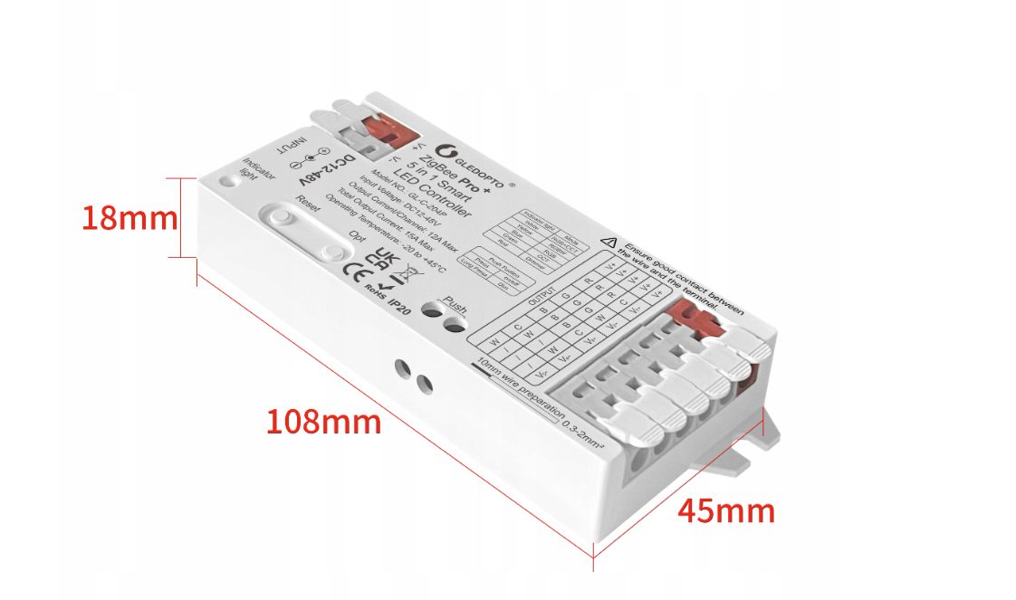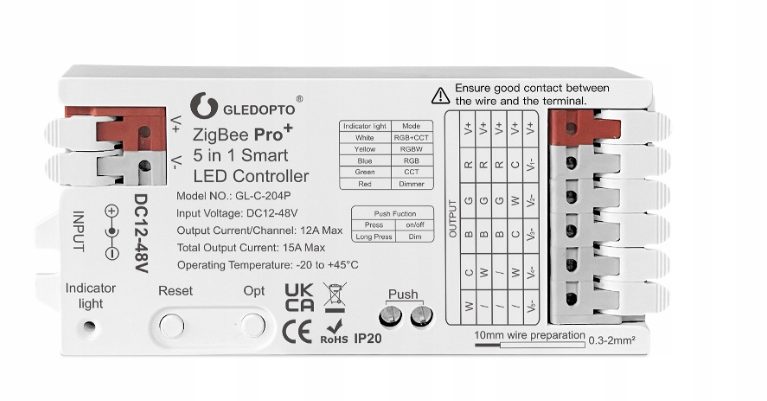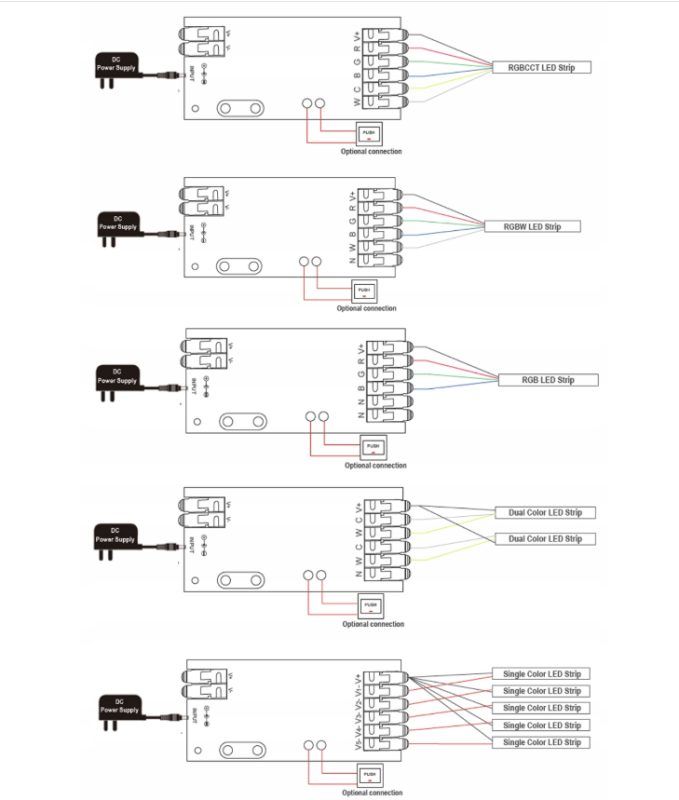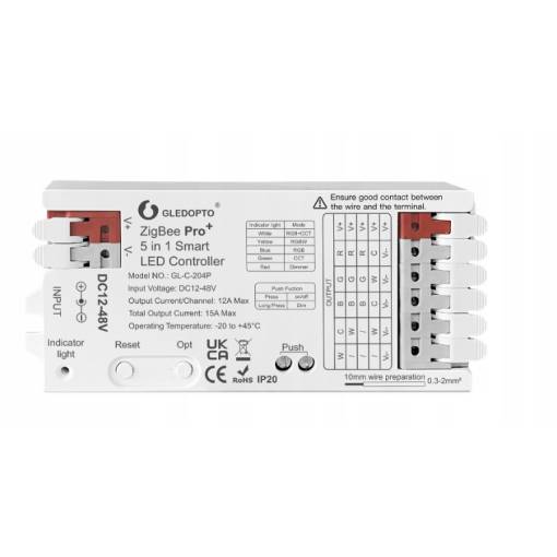 - Režimy: RGBCCT, RGBW, RGB, CCT, Dimmer
