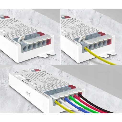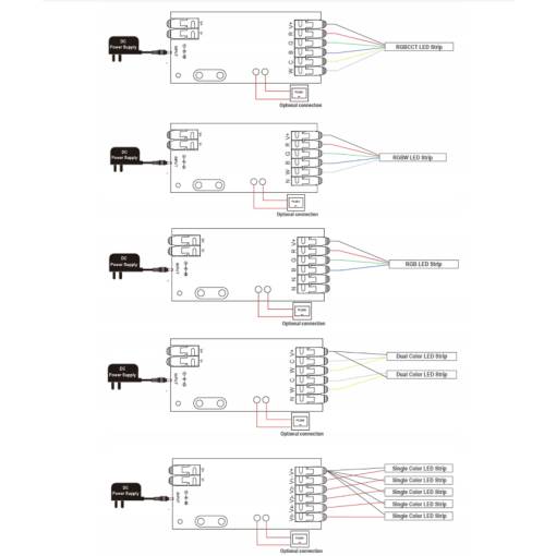 - Pripojte napájanie (12–24 V) k ovládaču a následne výstupy k LED pásu podľa počtu kanálov (max. 5in1).