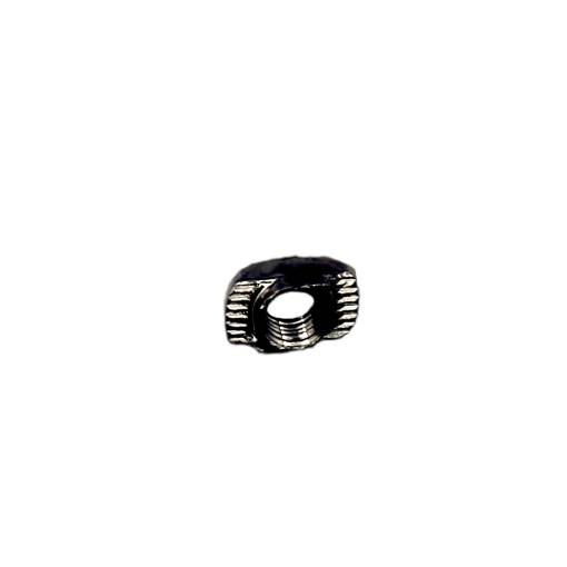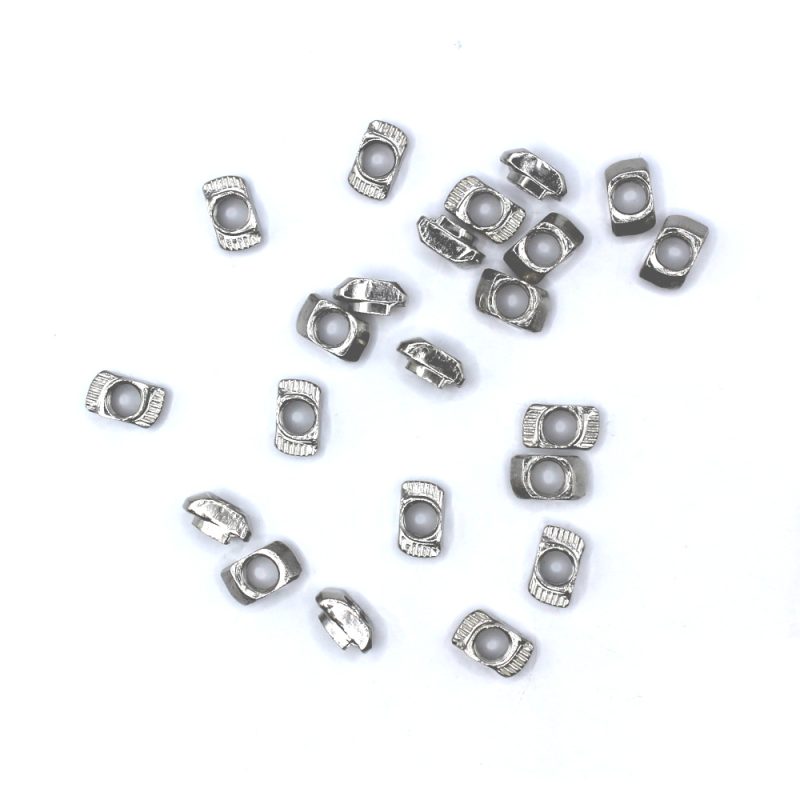 Oceľová matička určená do drážky hliníkových profilov 20x20. Tvar matice umožňuje jednoduchú montáž aj demontáž priamo zo strany profilu, bez nutnosti nasúvania alebo potreby špeciálneho kľúča. Drážkovanie na matici bezpečne fixuje pozíciu utiahnutej matice na zvolenom mieste.