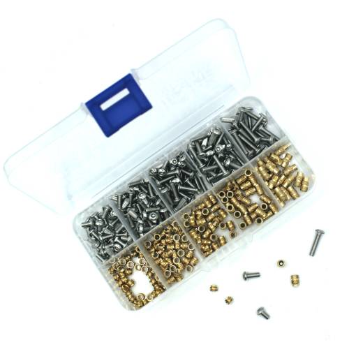 Sada zápustných vložiek so závitmi M3 a skrutkami so slušnou inbusovou hlavou pre všestranné využitie v najrôznejších projektoch a 3D tlači.