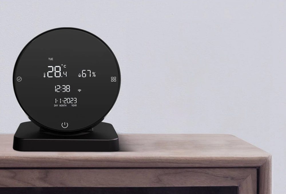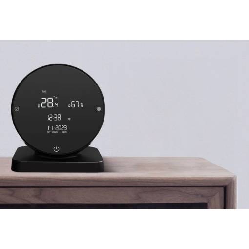 WHS20S je multifunkční zařízení integrující digitální teploměr, vlhkoměr a univerzální infračervený vysílač pro ovládání domácí elektroniky. Naměřené hodnoty jsou zobrazovány na podsvíceném LCD displeji a současně přenášeny přes WiFi do mobilní aplikace Tuya nebo Smart Life. Po připojení k síti zařízení automaticky synchronizuje přesný čas a datum z internetu, což eliminuje potřebu ručního nastavování. Konstrukce je vybavena otočným mechanickým rámečkem, který slouží k manuální regulaci jasu displeje a ke vstupu do režimu kalibrace senzorů. Zařízení dále obsahuje doplňkové funkce hodin, konkrétně dva nezávislé budíky, stopky a odpočet času.