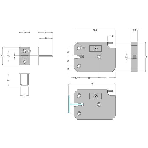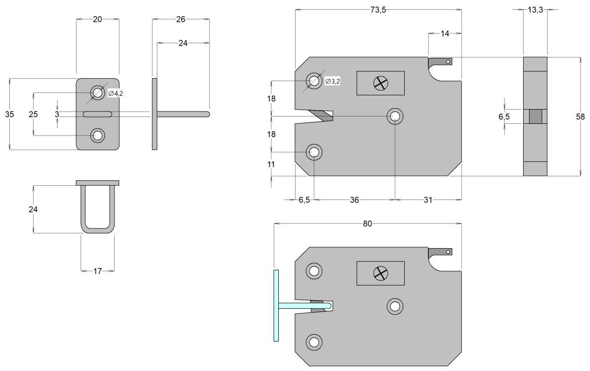 - Montážne otvory: Ø3,2mm pre skrutku so zápustnou hlavou.
